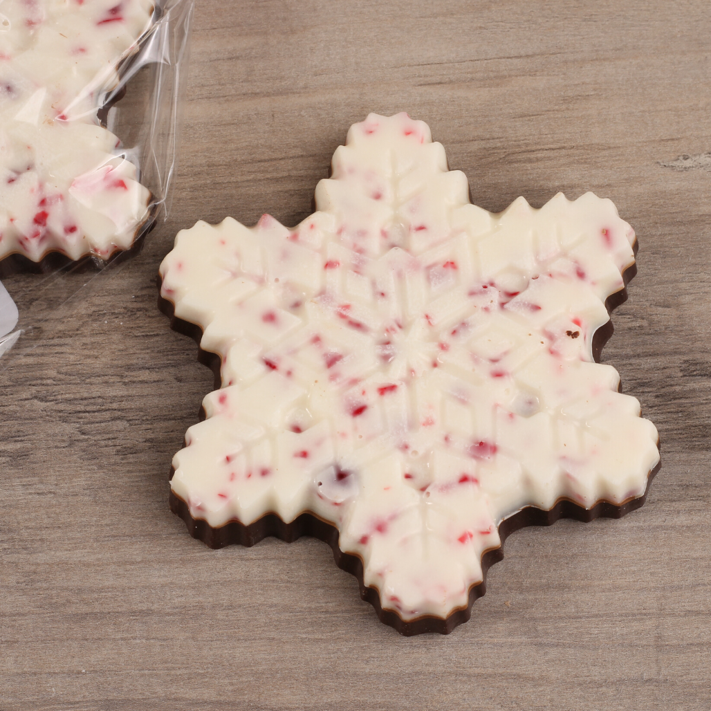 Each Snowflake consists of a layer of dark chocolate topped with a layer of white peppermint bark. Peppermint Snowflakes are perfect for gifts or holiday party favors! Each order contains one snowflake in a cello bag. Each Peppermint Snowflake is approximately 3 inches across.