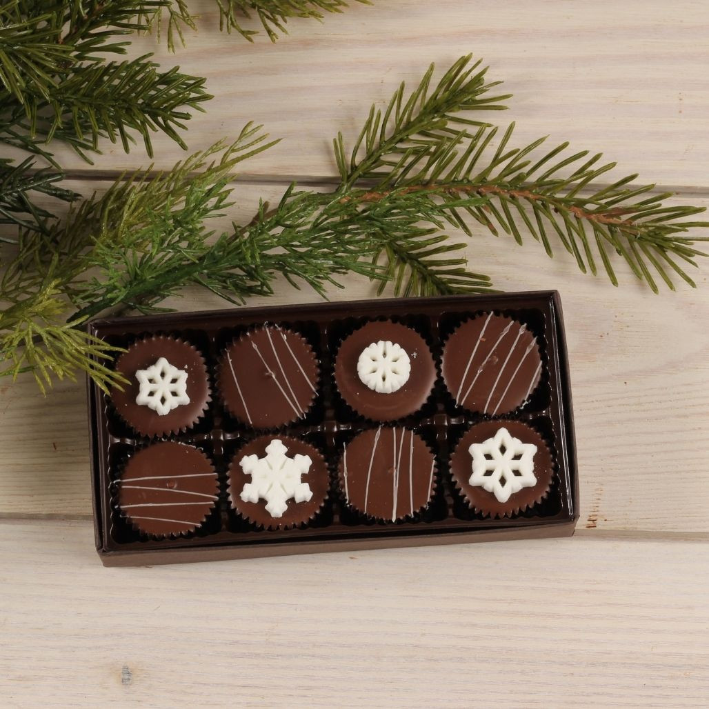 Holiday Peanut Butter Cups are topped with delicate white snowflakes and finely striped with white chocolate. Perfect for holiday season and wintertime. Each box contains 8 pieces.