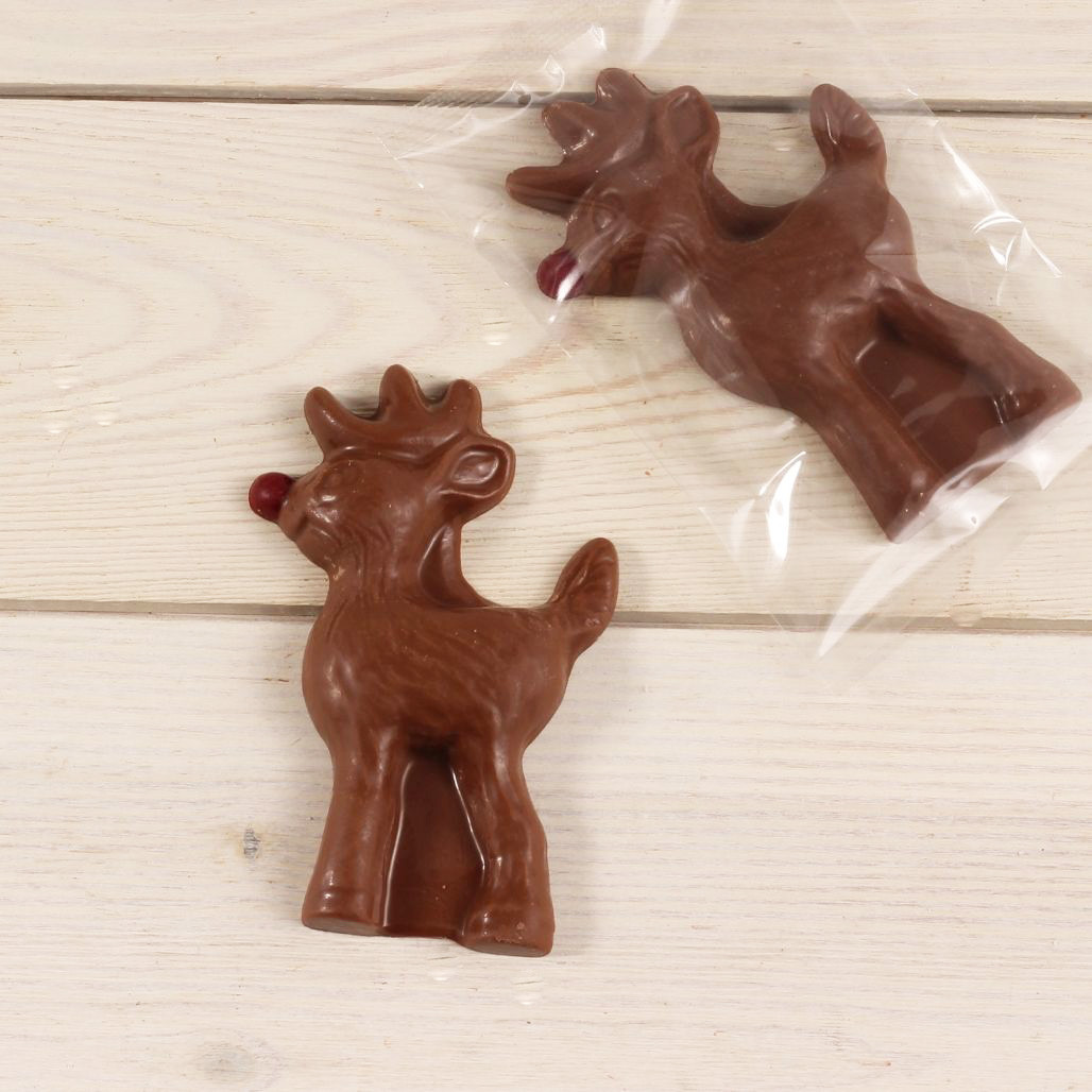 Solid milk chocolate Rudolph the red-nosed reindeer. Approximately 5 inches high by 3 inches wide. 2.5 oz.