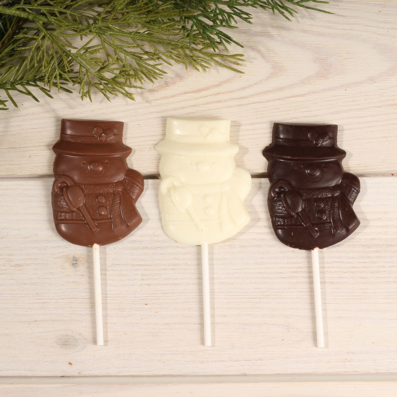 The adorable Snowman Pop is available in Milk, Dark or White. Each pop is 1 oz.